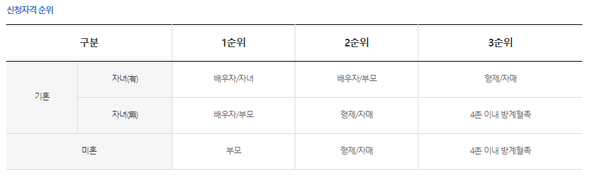 ※ 상속인이 미성년자인 경우 친권자가 신청자격 있습니다. (만 14세 이상 본인신청 가능) ※ 친권자가 없는 경우 후견인(구청신고) 가능합니다. ※ 신청2순위 이하는 동 순위 이상 자격자가 사망시 신청가능합니다. (사망여부 확인서류 지참)